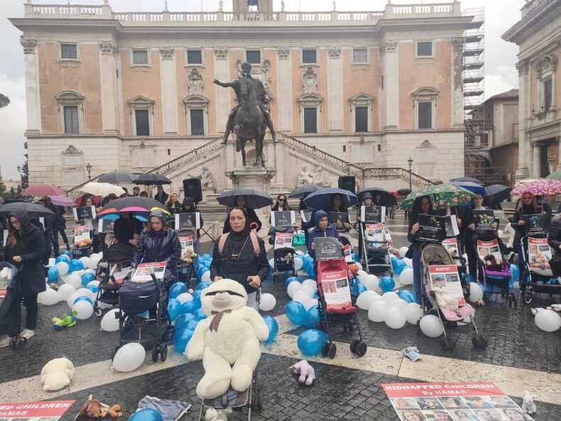 “Bring them home now” è il messaggio che si è levato quest’oggi anche da piazza del Campidoglio, nel corso di un flash mob di solidarietà agli ostaggi israeliani organizzato della Comunità ebraica di Roma. Sul selciato anche tante carrozzine, pupazzi e palloncini, per ricordare che tra le persone nelle mani di Hamas ci sono numerosi bambini e persino dei neonati.