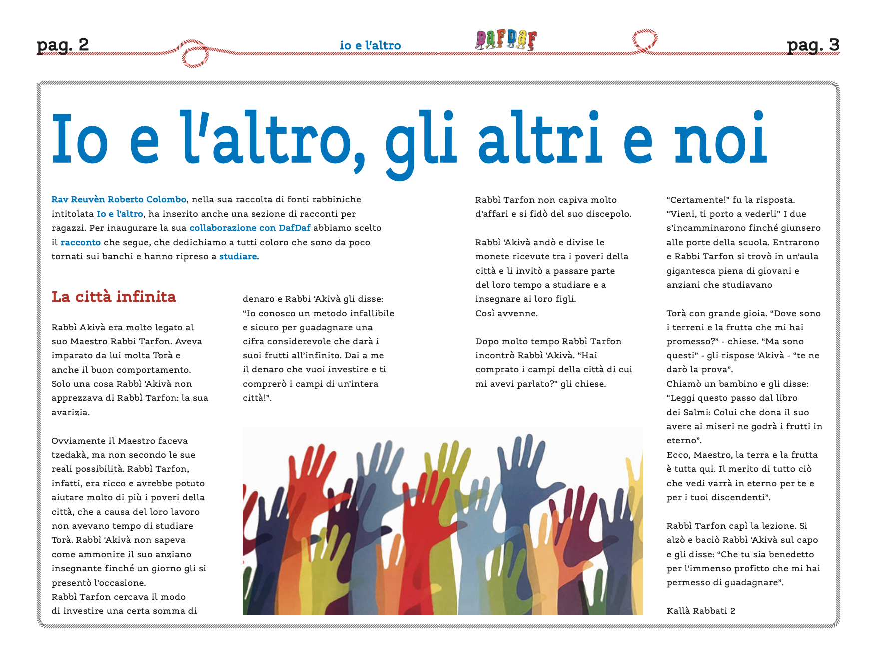 Come possiamo dare corpo e sostanza all’idea del tiqqun ‘olam (תיקון עולם)? Le prime pagine però sono dedicate a una nuova rubrica, tenuta rav Reuvèn Roberto Colombo: le fonti rabbiniche con la loro saggezza e gli insegnamenti che ci offrono ricordano come ogni gesto, anche piccolo, può avere effetti duraturi. Il “La città infinita”, il racconto che abbiamo scelto per aprire questa nuova collaborazione, Rabbì ‘Akivà trasforma l’avidità del suo maestro in un dono che cresce all’infinito: distribuendo le ricchezze tra i poveri e invitandoli a studiare Torah, egli mostra che la vera ricchezza non si misura in oro, ma nella conoscenza e nella capacità di fare il bene. Una lezione rivolta a chi, come molti giovani lettori, ha da poco ripreso i banchi di scuola, pronta a ispirare ogni passo di apprendimento.