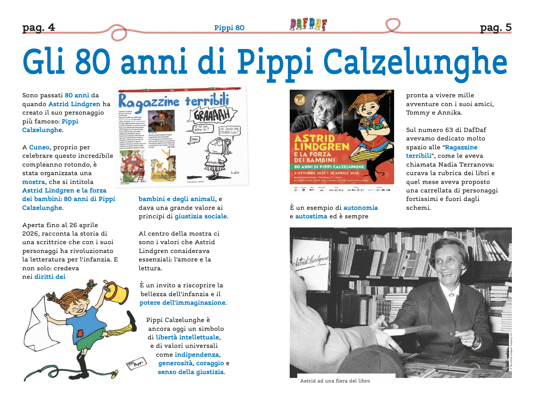 Si continua celebrando l’ottantesimo compleanno di Pippi Calzelunghe, personaggio straordinario creato da Astrid Lindgren e protagonista della mostra “Astrid Lindgren e la forza dei bambini: 80 anni di Pippi Calzelunghe”, a Cuneo. Pippi incarna libertà, coraggio e senso della giustizia: valori universali che non invecchiano mai, così come il suo spirito ribelle e indipendente continua a parlare ai bambini di oggi. Attraverso le illustrazioni di Björn Berg, Ilon Wikland e Ingrid Vang Nyman, la mostra ripercorre anche la storia di chi ha dato vita visiva a personaggi senza tempo, sottolineando quanto l’immaginazione e il talento artistico possano accompagnare la crescita dei giovani lettori.