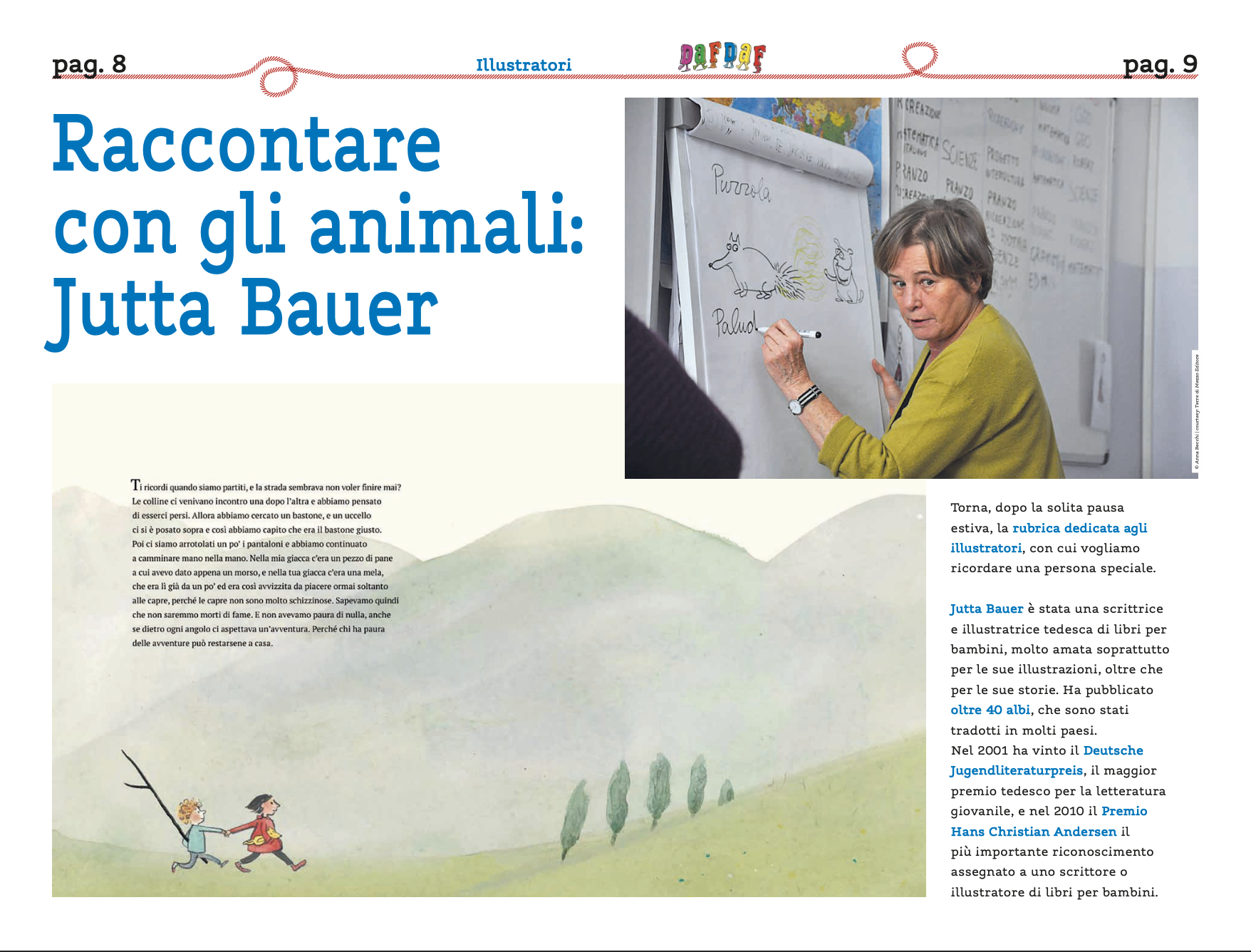In questo numero torna anche la rubrica dedicata agli illustratori, con un omaggio a Jutta Bauer, recentemente scomparsa, una delle voci più importanti della letteratura per l’infanzia. Attraverso le sue opere Bauer ha mostrato come gli animali nei libri possano raccontare emozioni profonde e universali, spesso con più forza degli esseri umani stessi. Le sue storie, nate dall’esperienza personale e dall’osservazione dei bambini, ci ricordano il ruolo centrale della creatività e della sensibilità visiva.