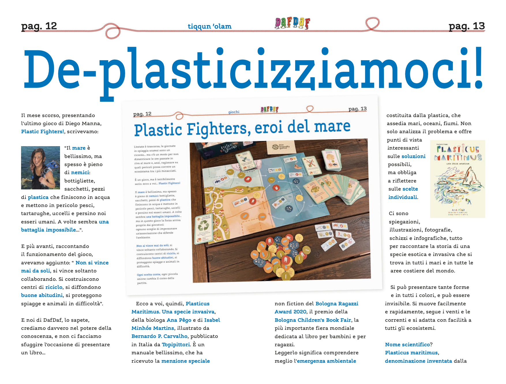 Arriviamo al nuovo appuntamento con i nostri lettori pronti ad aprire un nuovo capitolo di avventure e di scoperte. L’ultimo numero di DafDaf, il 160, era come da tradizione quello del compleANNO, che segnava il trascorrere del tempo, l’ingresso nel sedicesimo anno del giornale ebraico dei bambini, e l’avvio dell’anno ebraico (e dell’anno scolastico) mentre salutavamo le vacanze con Plastic Fighters, un gioco dedicato al mare e all’ambiente. Apriamo il numero 161 con Bernardo P. Carvalho, autore dell’illustrazione da cui abbiamo tratto la copertina: viene dal libro che abbiamo scelto per continuare il percorso iniziato lo scorso mese e che troverete all’interno del mensile: cosa significa, in concreto, “riparare il mondo”?