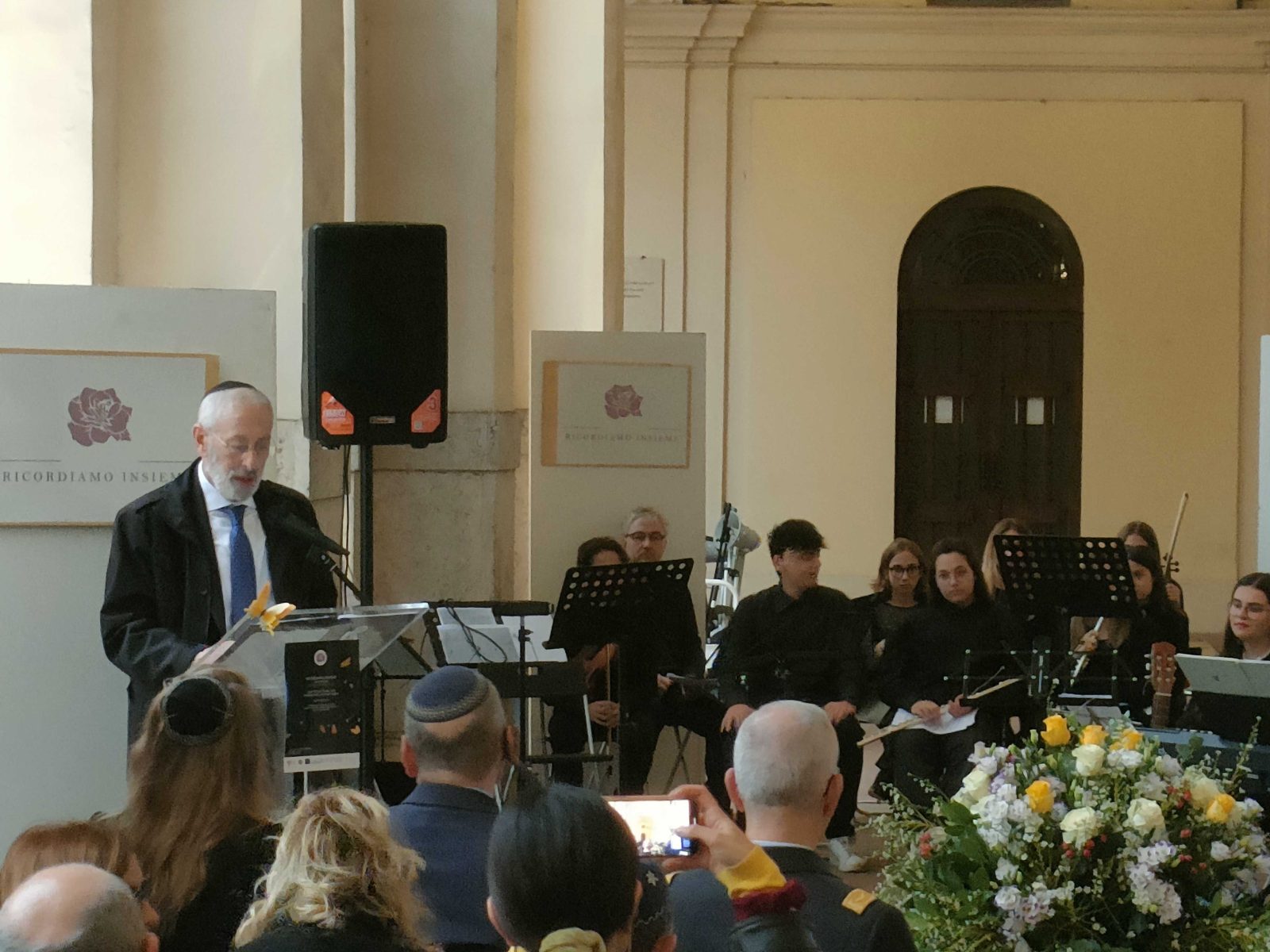 Ricordiamo Insieme è un’associazione animata dai coniugi Federika e Tobias Wallbrecher, insieme a Rivka Spizzichino. L’iniziativa di giovedì sera era dedicata alla memoria del padre di quest’ultima, Mario Spizzichino, figura molto attiva all’interno dell’ebraismo romano. «Papà ci ha insegnato a non lasciare mai solo nessuno», ha spiegato la figlia. «I nostri “standard” erano e restano quelli. Quali sono invece quelli di chi ha lasciato che oggi ci fossero quelle sedie vuote?», si è chiesta Spizzichino, indicando alcuni posti a sedere non occupati, dove sono stati attaccati dei fogli con la scritta «Non sono antisemita, ma…”. A differenza delle passate edizioni, sullo schermo nel quale scorrevano di solito i nomi dei 1022 deportati gli organizzatori hanno deciso di proiettare una selezione di messaggi d’odio che ogni giorno infestano il web e provocano effetti anche offline. Per il generale Danilo Morando del Casd, che ha portato i saluti del suo presidente, il generale Stefano Mannino, tre sono le parole chiave: memoria, speranza, cultura. «La responsabilità della memoria è un obbligo morale che ci dobbiamo portare dietro», ha dichiarato. «La speranza è che possa esserci una luce in fondo al buio, una luce che ci porti a condividere la diversità». In questo senso, la cultura è un mezzo fondamentale «per creare effetti positivi». Lello Dell’Arriccia, il presidente dell’associazione Progetto Memoria, ha ricordato che quanto avvenne a partire dall’alba del 16 ottobre «fu il logico e tragico epilogo delle leggi razziali» promulgate dal fascismo nel 1938. Dell’Arriccia si è soffermato in particolare sulla sorte dei bambini deportati, dei quali nessuno fece ritorno. «Quando si uccide un bambino si uccide una speranza», ha detto. È poi intervenuto l’arcivescovo Franco Saba, ordinario militare per l’Italia: «Ricordare insieme è un compito, una responsabilità. Conoscere è molto più di una semplice annotazione di fatti e accadimenti. Intessere un rapporto con la realtà apre alla condivisione». L’iniziativa si è aperta in piazza San Pietro, con un primo momento di riflessione. Sono intervenuti tra gli altri l’arcivescovo Flavio Pace, segretario del dicastero per l’unità dei cristiani, insieme al presidente della sezione romana dell’Aned, Andrea Di Veroli. Era inoltre presente il rabbino Noam Marans, direttore degli Affari interreligiosi dell’American Jewish Committee.