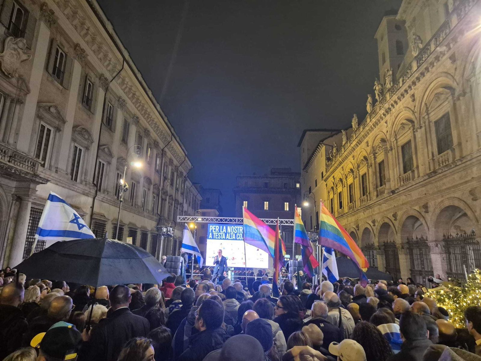 «Torneremo in piazza, torneremo a parlare». È la promessa di Stefano Parisi, il presidente dell’associazione Setteottobre, pronunciata al termine della manifestazione nazionale “Per la nostra libertà. A testa alta con gli ebrei”. Circa duemila le persone raccoltesi giovedì sera a Roma, in piazza Santi Apostoli, nonostante la pioggia scrosciante. In apertura di evento, condotta dal giornalista Antonino Monteleone, Parisi aveva scandito: «Per due anni abbiamo tollerato piazze antisemite. Dovevamo alzare la testa e dire agli ebrei: uscite di casa con i vostri simboli». Per Parisi, che ha denunciato una penetrazione di Hamas e dell’Islam radicale nel corpo profondo del paese, informazione inclusa, la difesa degli ebrei «è un valore universale».