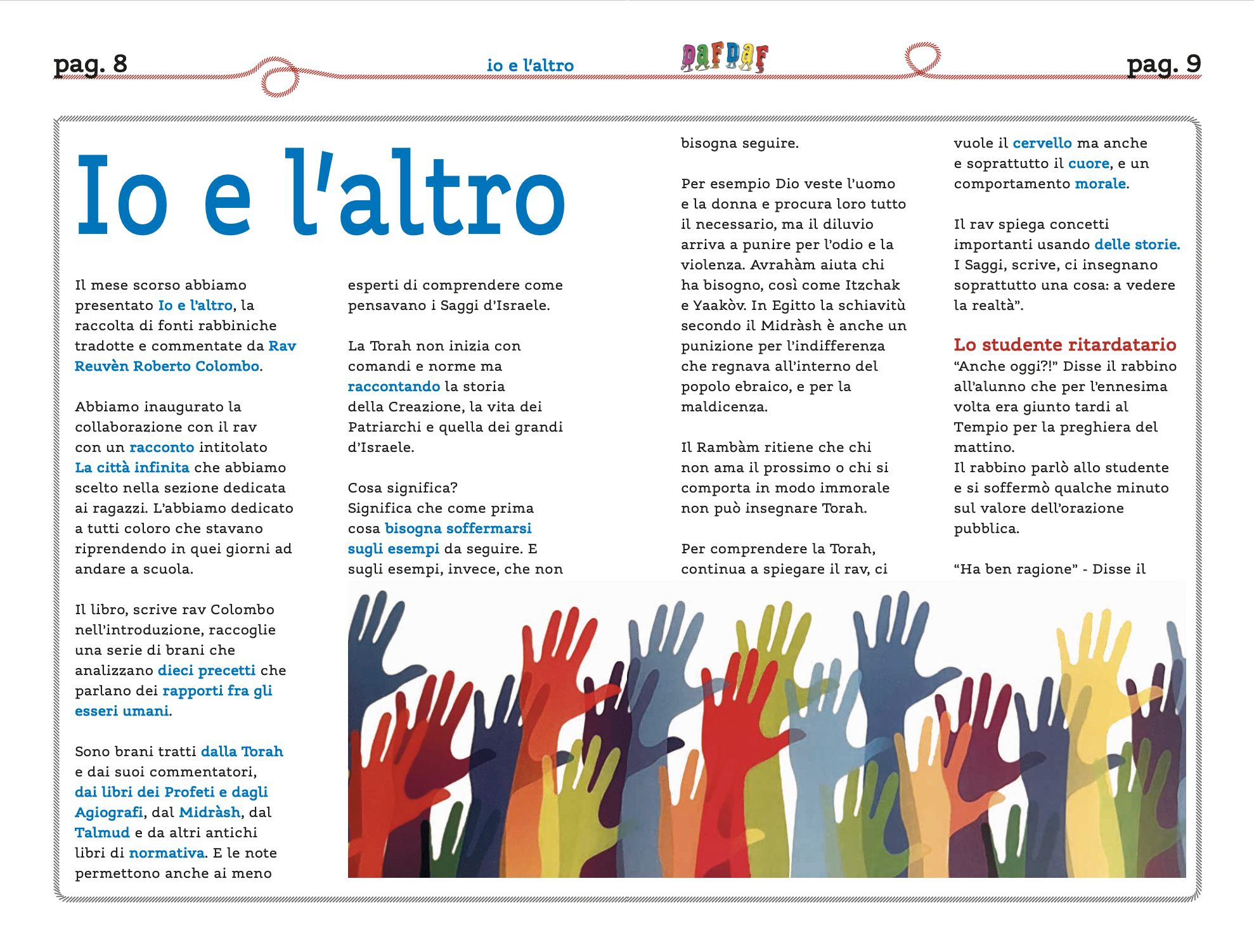normativa. Perché la Torah non inizia con comandi e norme ma raccontando la storia della Creazione, la vita dei Patriarchi e quella dei grandi d’Israele. E allora su DafDaf, grazie al rav, presentiamo questo mese ben due racconti, con la speranza che soffermarsi sugli esempi da seguire (e sugli esempi, invece, che non bisogna seguire) possa portare i lettori del giornale ebraico dei bambini a riflettere, usando non solo il cervello ma anche e soprattutto il cuore, per arrivare a un comportamento morale. E non potevamo ovviamente rinunciare al tema dell’anno, il tiqqun ‘olam, che per novembre decliniamo presentando il nuovo allestimento per ragazzi del Forte di Bard, in