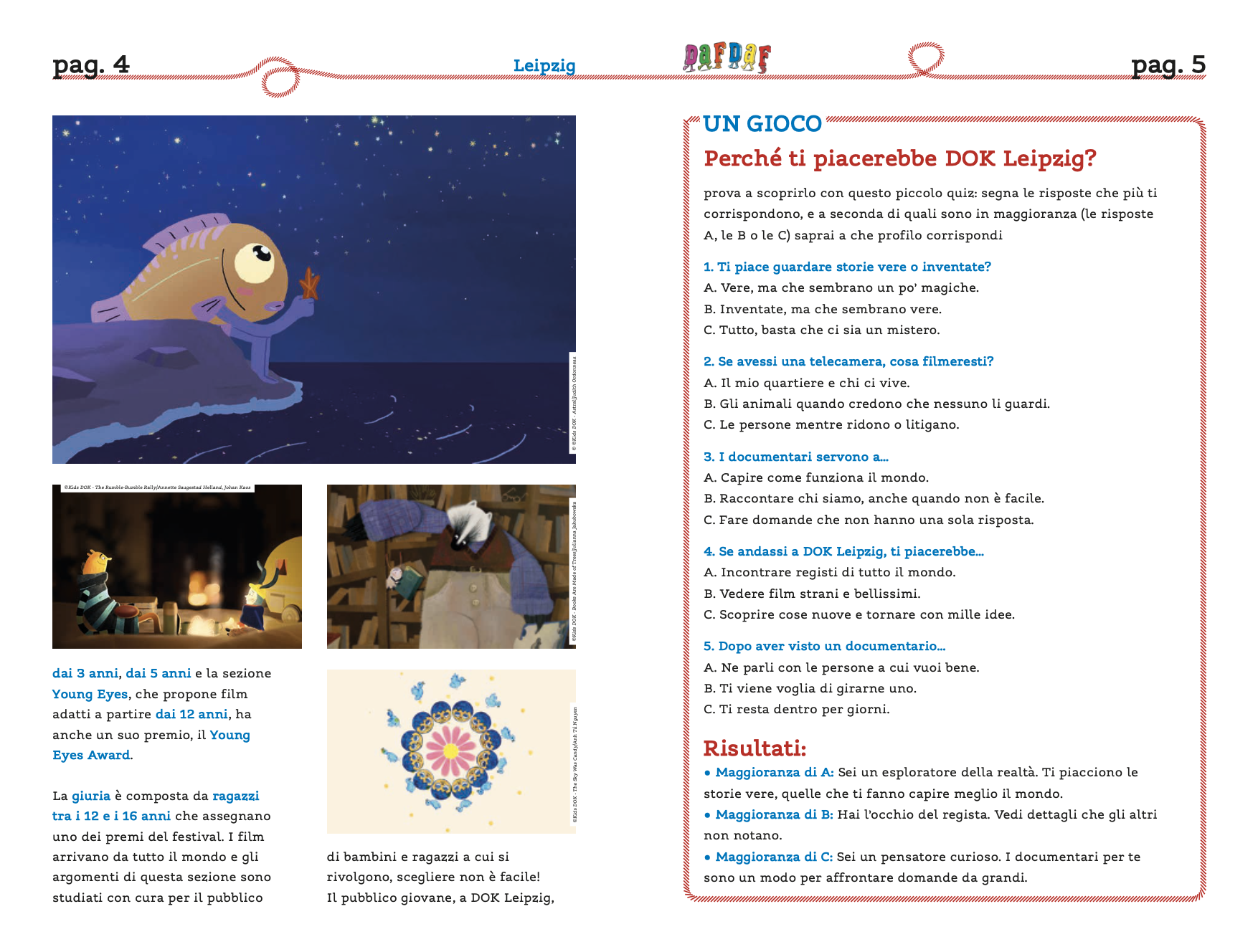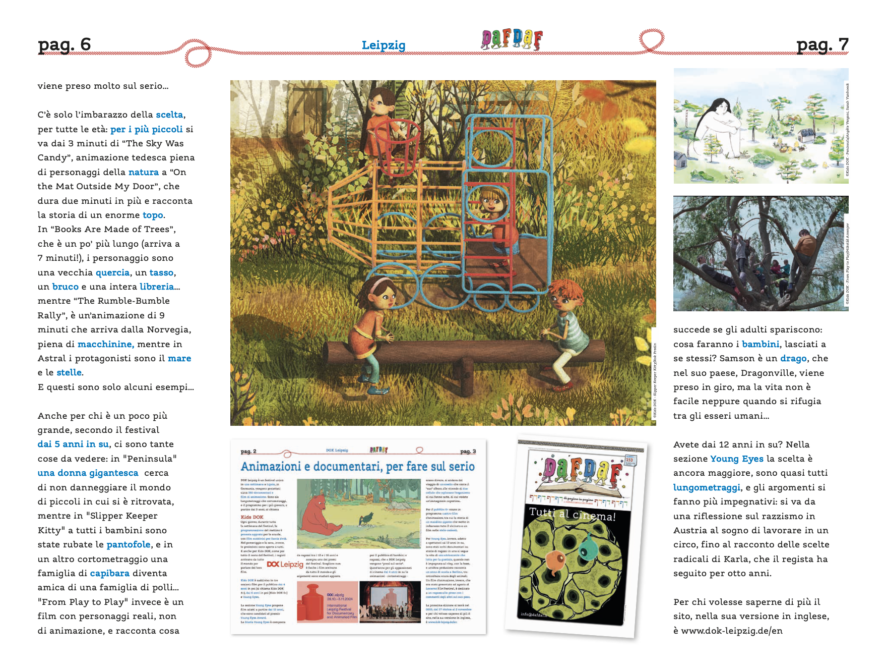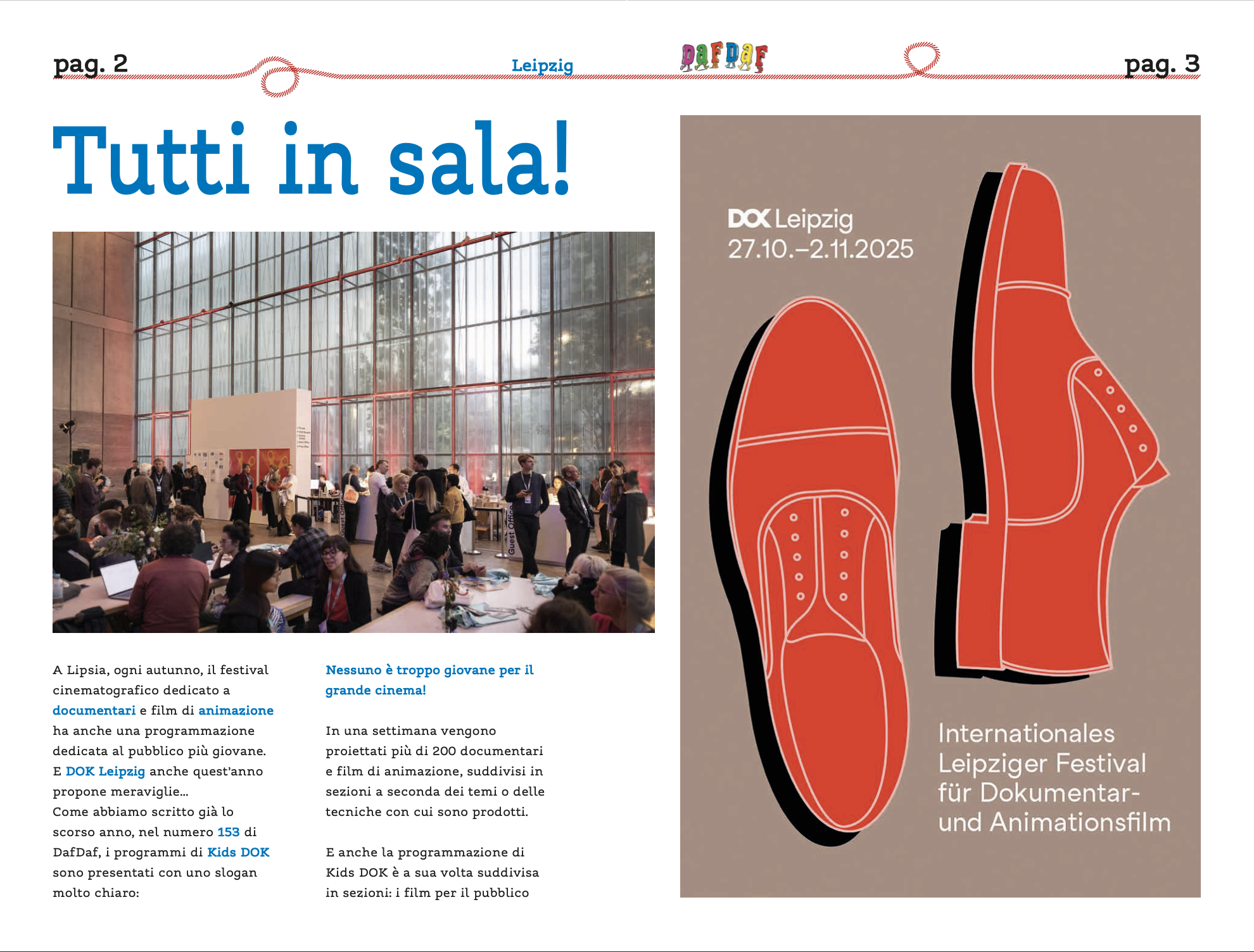 Il numero 162 di DafDaf, che ha raggiunto negli scorsi giorni i suoi giovani lettori, racconta cosa è stata l’edizione 2025 di DOK Leipzig, il festival cinematografico che “invade” Lipsia ogni autunno. Già lo scorso anno vi avevamo dedicato ampio spazio perché si tratta di un’occasione in cui il pubblico più giovane a ogni edizione riceve attenzioni davvero speciali. Ne avevamo scritto nel numero 153 e come allora anche quest’anno vi abbiamo dedicato diverse pagine, a partire dalla copertina. In una settimana – tanto dura il festival – vengono proiettati più di 200 tra documentari e film di animazione, suddivisi in sezioni. E anche la programmazione di Kids DOK, specificamente pensata per i piccoli, è a sua volta suddivisa: ci sono i film per il pubblico dai 3 anni, dai 5 anni e quelli della sezione Young Eyes, adatti a partire dai 12 anni. Quest’ultima ha anche un suo premio, il Young Eyes Award, la cui giuria è composta da ragazzi tra i 12 e i 16 anni che si confrontano per assegnare uno dei premi del festival. Perché il pubblico più giovane, a DOK Leipzig, viene preso molto sul serio.