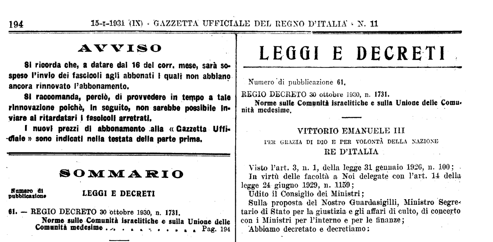 Nell’ambito del sistema normativo introdotto circa un secolo fa, il regime statale di controllo sulle comunità non era frutto di una particolare volontà intrusiva, quanto piuttosto un segno della subordinazione degli enti comunitari ebraici (equiparati agli enti pubblici e inquadrati come istituti di un culto ammesso): il regio decreto 30 ottobre 1930, n. 1731, “Sulle comunità israelitiche e sulla Unione delle comunità medesime”, comunemente conosciuto come legge Falco, e il successivo regolamento di applicazione 19 dicembre 1931, n. 1561, di fatto sottoponevano all’autorità dello Stato ogni forma di attività ebraica, specie quelle organizzate su base collettiva.