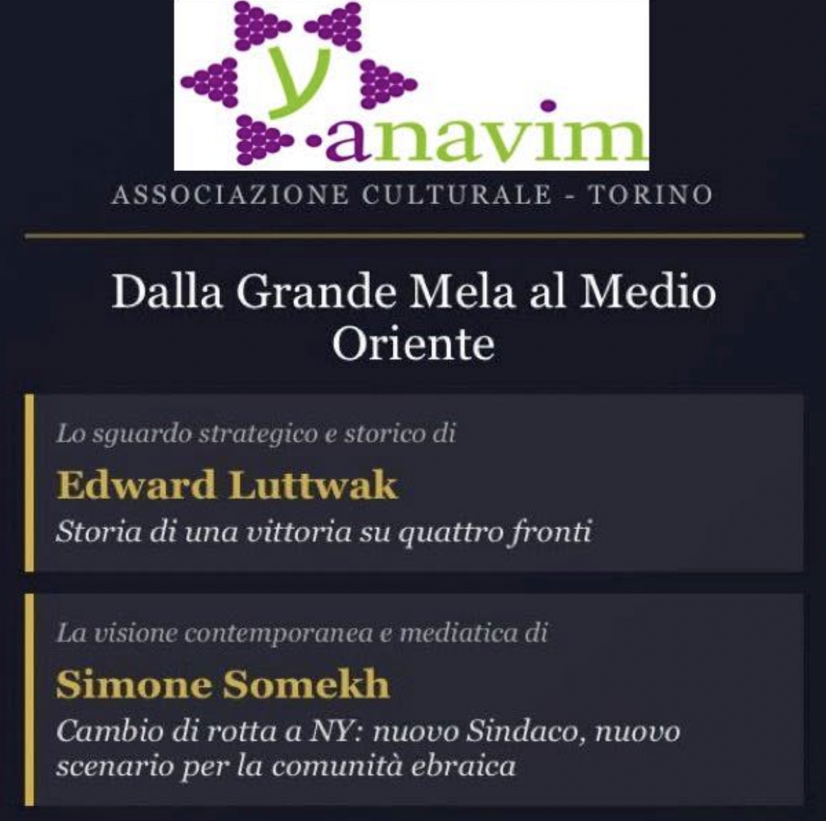 Prenderanno la parola due ospiti, Edward Luttwak e Simone Somekh. E mentre il primo, politologo ed esperto di strategie militari, affronterà “La storia di una vittoria su quattro fronti” nel conflitto mediorientale; il secondo, giornalista, approfondirà “il cambio di rotta” impresso a New York dopo la recente elezione a sindaco di Zohran Mamdani. Cosa cambia adesso per gli ebrei newyorkesi? Per richiedere il link per partecipare all’iniziativa, è necessario scrivere a: associazioneanavim@gmail.com