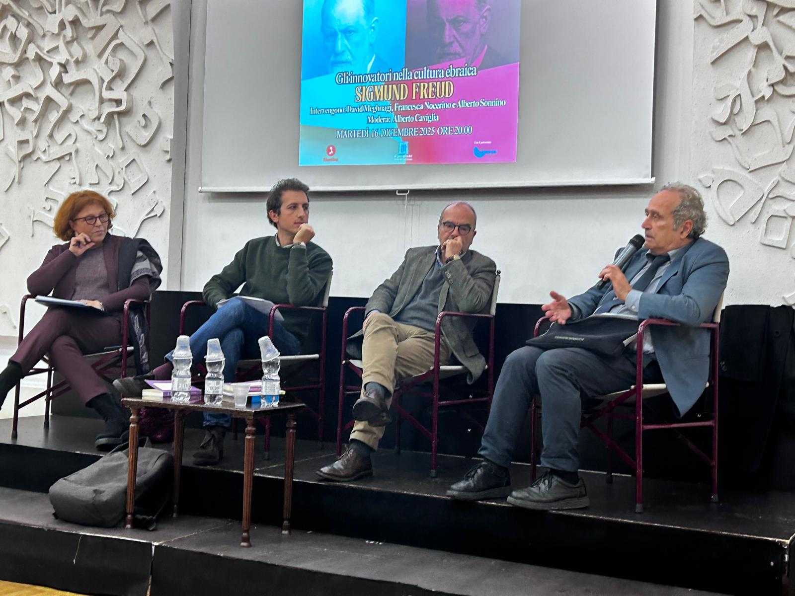 Era dedicato a Sigmund Freud, il padre della psicoanalisi, il sesto incontro del ciclo “Innovatori nella cultura ebraica” organizzato dal Centro Ebraico Il Pitigliani di Roma in collaborazione con la casa editrice Giuntina e la libreria ebraica Kiryat Sefer. A parlarne gli psicoanalisti David Meghnagi e Alberto Sonnino e la giornalista Francesca Nocerino, moderati da Alberto Caviglia. Nel corso dell’iniziativa, patrocinata da Ucei e Comunità ebraica romana, Meghnagi per primo si è soffermato sulla teoria di Freud, «una teoria basata sull’immaginazione al potere» e in quanto tale da considerare «arte e non solo scienza, oppure scienza in quanto arte». Per Meghnagi, una delle prove della grandezza di Freud è l’aver immaginato il funzionamento del cervello «senza poterlo vedere». Sonnino ha poi toccato il tema dell’ebraismo in Freud, «che si considerava profondamente laico e al tempo stesso ha vissuto con passione e coinvolgimento la sua identità ebraica». In quest’ottica Sonnino ha invitato alla lettura del saggio Il Mosè di Freud. Giudaismo terminabile e interminabile di Yosef Hayim Yerushalmi, pubblicato in Italia da Giuntina, il cui sottotitolo è una chiave di «trasmissione dell’identità ebraica anche laddove si dovessero rifiutare i canoni fondamentali della religione: Freud si ritrova pienamente in quella condizione». Nocerino si è addentrata nel rapporto tra psicoanalisi e cinema, ricordando come in entrambi i casi la pietra miliare sia l’anno 1895. Mentre Freud pubblicava a Vienna i suoi studi sull’isteria, a Parigi i fratelli Lumière proiettavano “La sortie des ouvriers de l’usine”. «Psicoanalisi e cinema hanno lo stesso obiettivo: indagare l’animo umano», ha affermato Nocerino. «Freud i sogni li indagava, mentre il cinema li ha inventati».