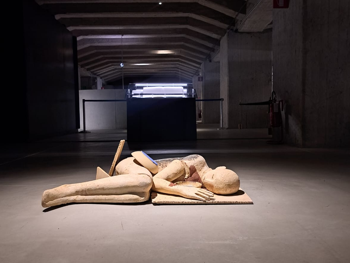 Chiude la mostra, l’incontro con l’opera Il Dormiente. Una figura distesa, raccolta, collocata come ultima stazione della mostra. «È stato un regalo inatteso da parte di Paladino», spiega Composti «Un dono straordinario». Nella riflessione originaria dell’artista, l’opera rimandava ai corpi che durante la Seconda guerra mondiale si rifugiavano nei sotterranei di Londra per sfuggire ai bombardamenti. «Il Dormiente è un punto di arresto», sottolinea la curatrice. «Da una parte è un monito: viviamo un tempo in cui non possiamo permetterci di dormire, di essere indifferenti, come recita il muro all’ingresso del Memoriale della Shoah. Dall’altra, però, è anche un’immagine di speranza: il dormiente non è morto, è in attesa. È come se fosse sospeso in una condizione di calma, di protezione, di nuove possibilità».