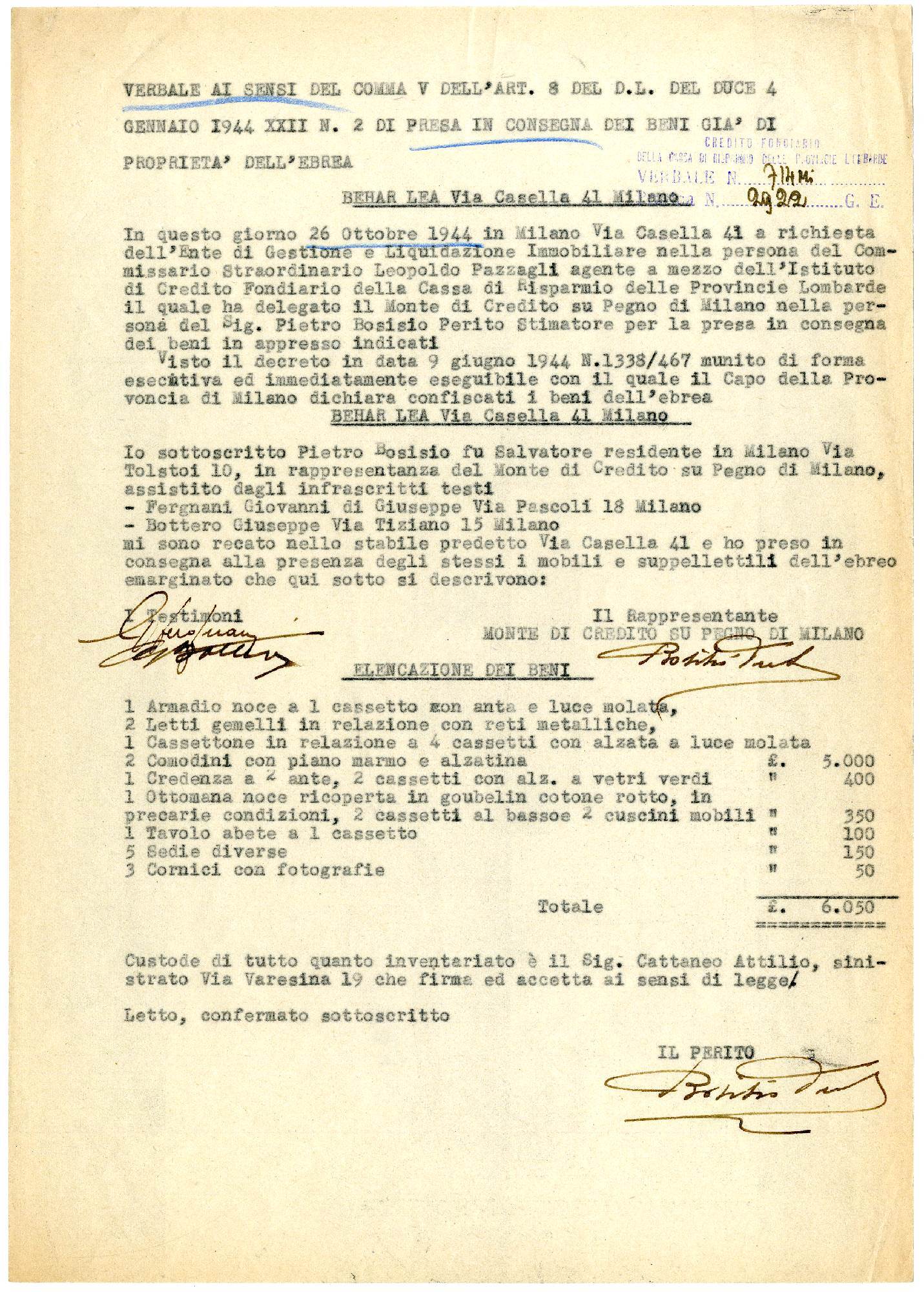 Un armadio in noce a un cassetto, due letti gemelli con reti metalliche, un tavolo in abete, cinque sedie diverse, tre cornici con fotografie. È un elenco asciutto, battuto a macchina, chiuso da un totale: 6.050 lire. A stilare l’inventario è un perito del Monte di Credito su Pegno, il 26 ottobre 1944, in un appartamento di via Casella 41, a Milano. Quegli oggetti appartenevano a Lea Behar. Quando i funzionari entrano in casa, Lea e la figlia Sara sono già state deportate e assassinate ad Auschwitz.