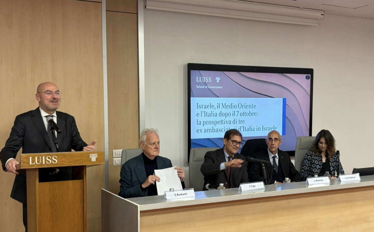 «Stiamo aprendo una breccia. Lo so anche per esperienza personale, è molto difficile entrare negli ambienti universitari e discutere di questi temi in modo pacato. È un autentico privilegio». Nelle parole di Luigi Mattiolo c’è forse una sintesi dell’incontro “Israele, il Medio Oriente e l’Italia dopo il 7 ottobre: la prospettiva di tre ex ambasciatori d’Italia in Israele” svoltosi martedì pomeriggio nel campus dell’Università Luiss di Roma. L’evento è stato presentato come una possibilità per ragionare con degli addetti ai lavori qualificati, in un periodo in cui a prevalere in molti ambienti, università incluse, sono estremismi ideologici e polarizzazioni. Accanto a Mattiolo, che ha rappresentato l’Italia in Israele dal 2008 al 2012, c’erano i suoi successori Francesco Talò (2012-2017) e Sergio Barbanti (2021-2024). Ha introdotto l’incontro un intervento di Giovanni Orsina, a capo del dipartimento di Scienze Politiche dell’ateneo. Le riflessioni degli ambasciatori sono state moderate dalla storica Carolina De Stefano.