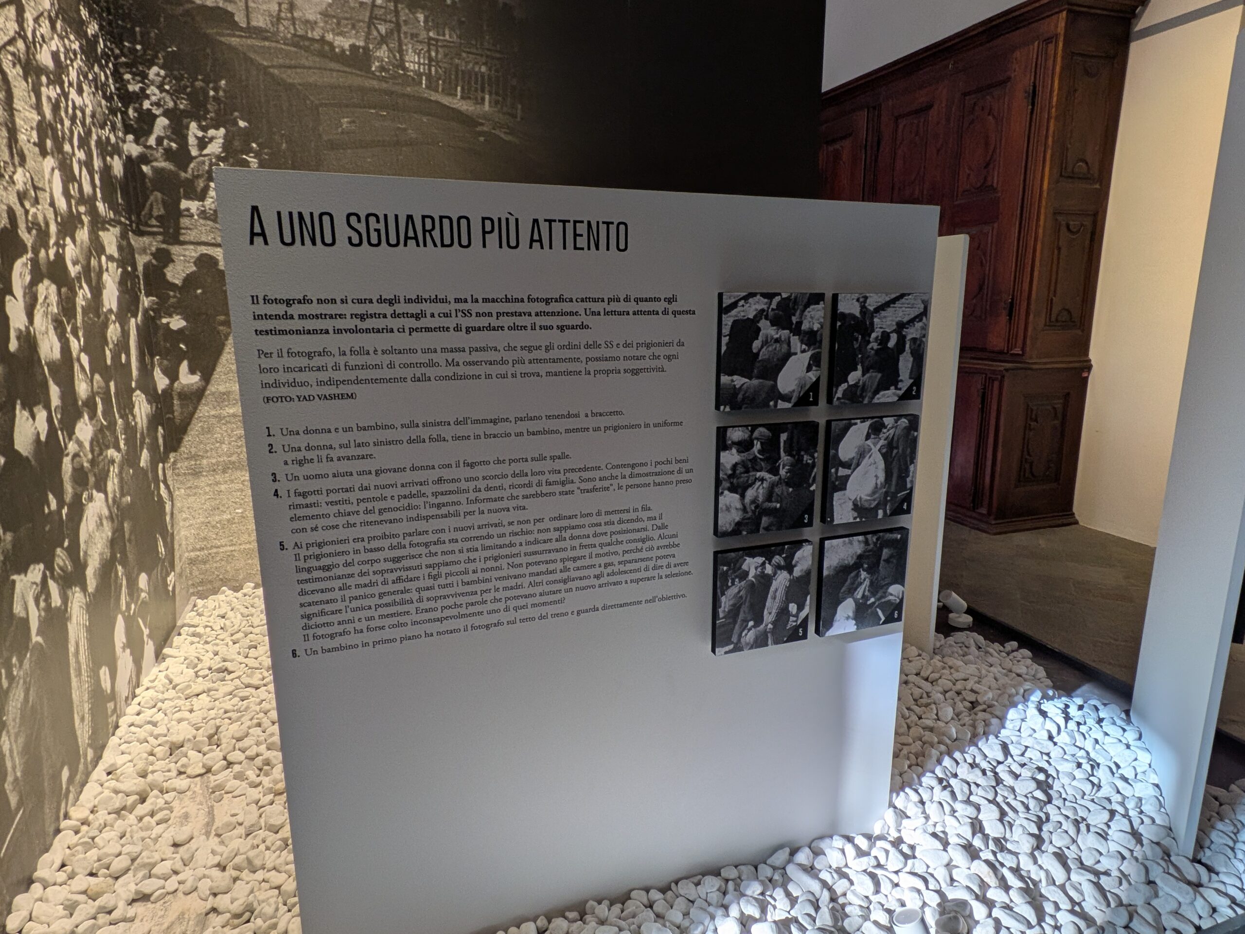 sistema, non il suo esito». Osservandole con attenzione negli ingrandimenti che aprono la mostra, qualcosa sfugge al controllo di chi scatta. «Il fotografo delle SS, posizionato probabilmente sul tetto di un vagone, intende riprendere una folla anonima all’arrivo del treno ad Auschwitz», sottolinea la curatrice, indicando la gigantografia, «ma la macchina fotografica registra molto di più: un uomo aiuta una donna a portare il suo fagotto; una madre stringe il suo bambino aiutata da un prigioniero; un altro prigioniero scambia poche parole con una nuova arrivata, forse le sussurra consigli su come comportarsi. Sono dettagli involontari, ma raccontano che l’umanità non è ancora stata cancellata. Poi c’è un bambino che guarda direttamente in camera: si è accorto del fotografo e lo fissa. Oggi guarda noi».