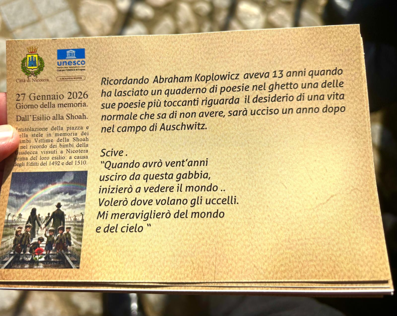 Nel Giorno della Memoria il Comune calabrese di Nicotera, in provincia di Vibo Valentia, ha intitolato una piazza della sua Giudecca ai bambini assassinati nella Shoah. Estendendo il ricordo, nella piazza e in una stella, ai bambini ebrei che dovettero lasciare questa terra in ragione dei decreti di espulsione emanati tra 1492 e 1510. Il proposito, condiviso con l’Ucei e la Comunità ebraica di Napoli competente territorialmente, è di restituire ai fuggiaschi di un tempo «il diritto di appartenenza, un nome e una casa tra queste pietre che un tempo li videro felici».«Questa piazza, qui nella Giudecca di Nicotera, ha un valore speciale. Per quanto ci è dato sapere, è l’unica in Italia dedicata esplicitamente ai bambini vittime della Shoah», ha dichiarato il vicepresidente Ucei Giulio Disegni. Da oggi, ha proseguito, «questo luogo dialoga con una storia ancora più antica».