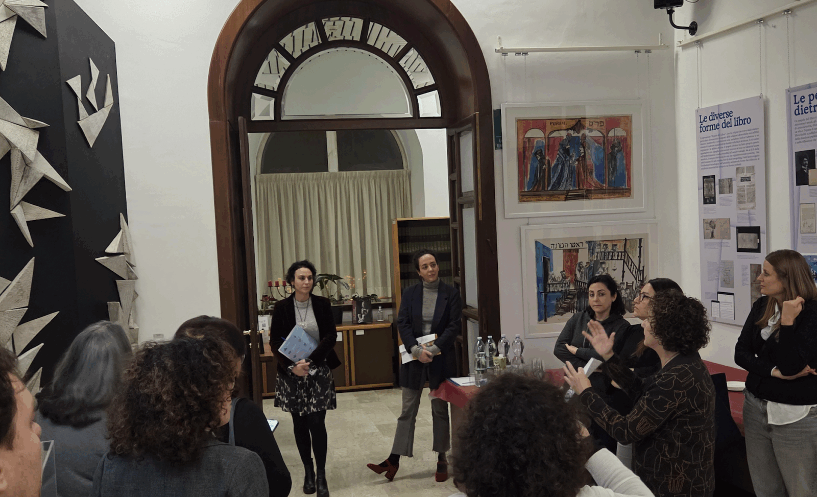 Una mezuzà e un pubblico invitato a fare domande. Si è aperto così, nella sede della Fondazione Beni Culturali Ebraici in Italia e della Biblioteca Nazionale dell’Ebraismo Italiano “Tullia Zevi” a Roma, l’incontro conclusivo di Midor Ledor Europe, il percorso di formazione dedicato alla trasmissione del patrimonio culturale ebraico italiano ed europeo coordinato da chi scrive e Michelle Sembira e finanziato dall’Unione Europea. Offrendo al pubblico l’occasione di conoscere da vicino le metodologie, gli obiettivi e i risultati del percorso, l’appuntamento ha rappresentato un momento di sintesi e di restituzione pubblica del progetto sviluppato nell’arco di due anni. L’ospite d’onore dell’incontro è stata l’artista Ariela Böhm, autrice dell’opera simbolica posizionata all’ingresso della biblioteca: la mezuzà realizzata nel 1990 su richiesta di Tullia Zevi. La mezuzà è stata il punto di partenza di una riflessione condivisa, avviata con un esercizio di osservazione partecipata: una tecnica che invita il pubblico a descrivere, interrogare e interpretare ciò che vede trasformando, in questo caso, l’opera in uno strumento di dialogo e di narrazione collettiva.