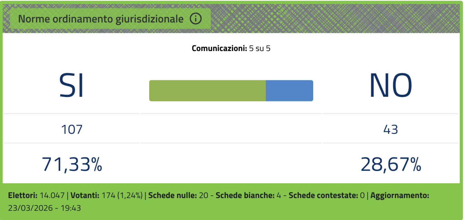 I dati vanno letti tenendo conto di una particolarità amministrativa: il voto degli italiani nell’area è ripartito in due circoscrizioni distinte. Alla circoscrizione “Israele” appartengono i numeri appena citati; quella autonoma, che comprende Gerusalemme e i territori palestinesi, ha registrato una partecipazione più alta: 302 votanti su 2.578 elettori, pari all’11,71 per cento. Qui il Sì ha prevalso con 155 voti (53,08 per cento), contro i 137 del No (46,92 per cento).