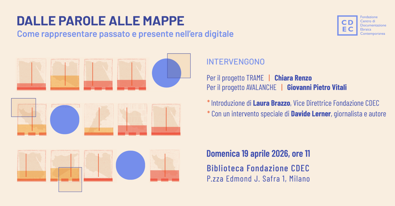 «Gli strumenti digitali permettono di rappresentare la complessità delle migrazioni ebraiche nel Mediterraneo, qualcosa che sarebbe molto difficile restituire con metodi tradizionali». Per Chiara Renzo, storica e curatrice del progetto Trame della Fondazione CDEC di Milano, è da qui che bisogna partire: dalla possibilità di vedere, nello spazio e nel tempo, storie che altrimenti resterebbero frammentate tra le carte d’archivio. Di questo si parlerà domenica 19 aprile alle 11 alla Biblioteca del Cdec, nell’incontro “Dalle parole alle mappe. Come rappresentare passato e presente nell’era digitale”, un appuntamento dedicato al rapporto tra memoria, fonti e strumenti digitali. Accanto a Renzo interverrà Giovanni Pietro Vitali per il progetto Avalanche. L’incontro sarà introdotto da Laura Brazzo, vicedirettrice della Fondazione Cdec, con un intervento del giornalista Davide Lerner.