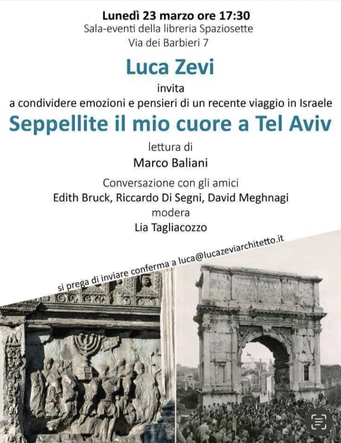 Nella sala eventi della libreria Spaziosette a Roma (via dei Barbieri 7), lunedì 23 marzo alle 17.30 è in programma l’incontro “Seppellite il mio cuore a Tel Aviv”. L’architetto Luca Zevi condividerà emozioni e pensieri di un recente viaggio in …